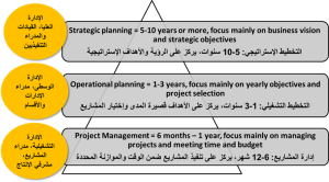 - يمثل الشكل السابق ثلاثة مستويات من الإدارة: المستوى الأول ويأتي في قمة الهرم ويعرف بالمستوى الإستراتيجي ويستخدم التخطيط الإستراتيجي والخطة الإستراتيجية كأداة أساسية في التخطيط ويضم الإدارة العليا والقيادات والمدراء التنفيذيين، وتتراوح مدة الخطة الإستراتيجية من 5-10 سنوات أو أكثر، وتركز على الرؤية والرسالة والأهداف الإستراتيجية للمنظمة.